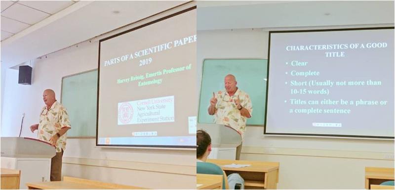 Harvey Reissig教授为探花系列 师生做了题为“PARTS OF A SCIENTIFIC PAPER, 2019”的学术报告,来自植保探花系列 、资环探花系列 等30余名师生参加了报告会。Harvey Reissig教授以案例的形式全面讲授了科技论文写作中同学们存在的常见问题,针对昆虫分类学科技论文写作进行了详细的讲解。报告结束后,参会师生就所关心的写作问题积极地与Harvey Reissig教授进行了热烈的交流和深入探讨。
