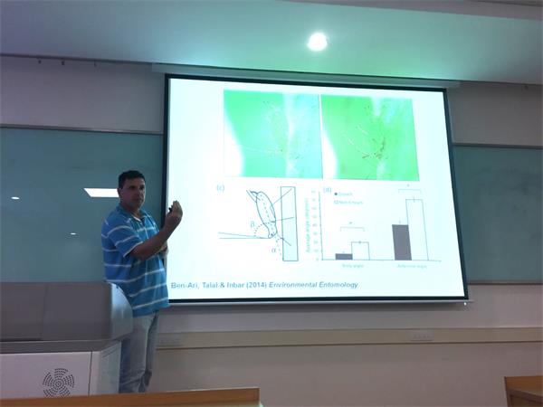 以色列海法大学Moshe Inbar教授于2016年6月25日至7月1日来探花系列 进行科研合作与交流,并为广大师生做了两场精彩的学术报告。6月27日,Moshe Inbar教授为师生作题为“Defense strategies in pea aphids”的学术报告。报告展示了豌豆蚜虫在跌落的过程中通过旋转自己的身体到稳定的直立方向,从而提高了在途中遇到植物叶片时附着的机会,降低掉落到地面的危险,它们通过这种方式逃避天敌进行自我防御。6月29日,Moshe Inbar教授作题为“Functional ecology of host plant manipulation by gall forming insects”的报告,向大家讲述了奇妙的造瘿昆虫,以及这些昆虫的造瘿机制。在报告的互动环节,Moshe Inbar教授与探花系列 师生就共同感兴趣的相关问题进行了详细的探讨,精彩的提问和妙趣横生的回答获得了大家热烈的掌声。