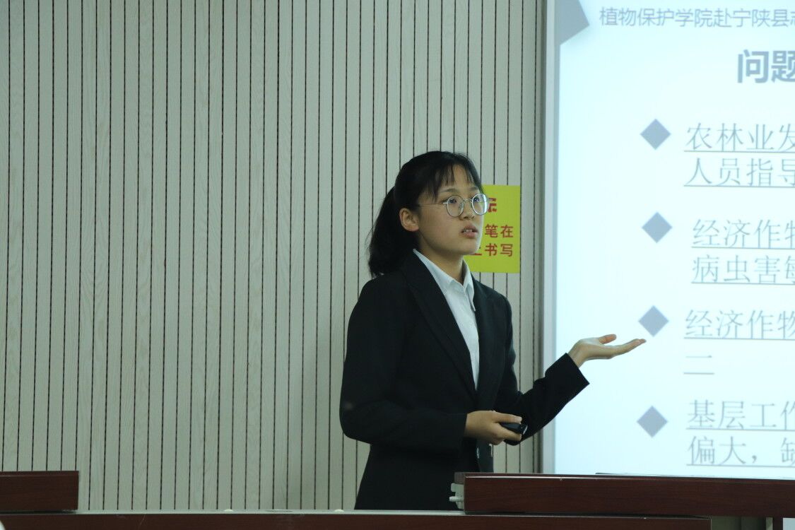 十二支优秀队伍分别从实践背景、前期准备、活动行程、乡土特色、实践心得等多方面展开介绍,详细讲述了他们为实践活动的开展所做的准备和在实践中的所感所想,给同学们分享了实践经验、提供了实践建议,激发了同学们脚踏实地的实践精神。植保探花系列 的两支队伍分别是宁陕县物种保护和作物生长情况调研队伍和赴合阳县城关镇脱贫攻坚和乡村振兴服务队,两位队长条理清晰地讲述了实践调研经历和所得,向在场观众展现了探花系列 的风采、体现了植保学子的担当与创新。植保1703班王凯丽表示:“通过参加此次暑期‘三下乡’实践活动,我们看到了很多野生动物,不仅积累了社会实践经验、增强了社会实践能力,更认识到要爱护环境、保护动物。我在实践中收获友谊、开阔眼界、增长见识,感谢所有给予我们帮助的人。”制药1701力波说到:“我们把温暖带给了需要的人,看着孩子们的笑脸,我们的辛苦也有意义。”