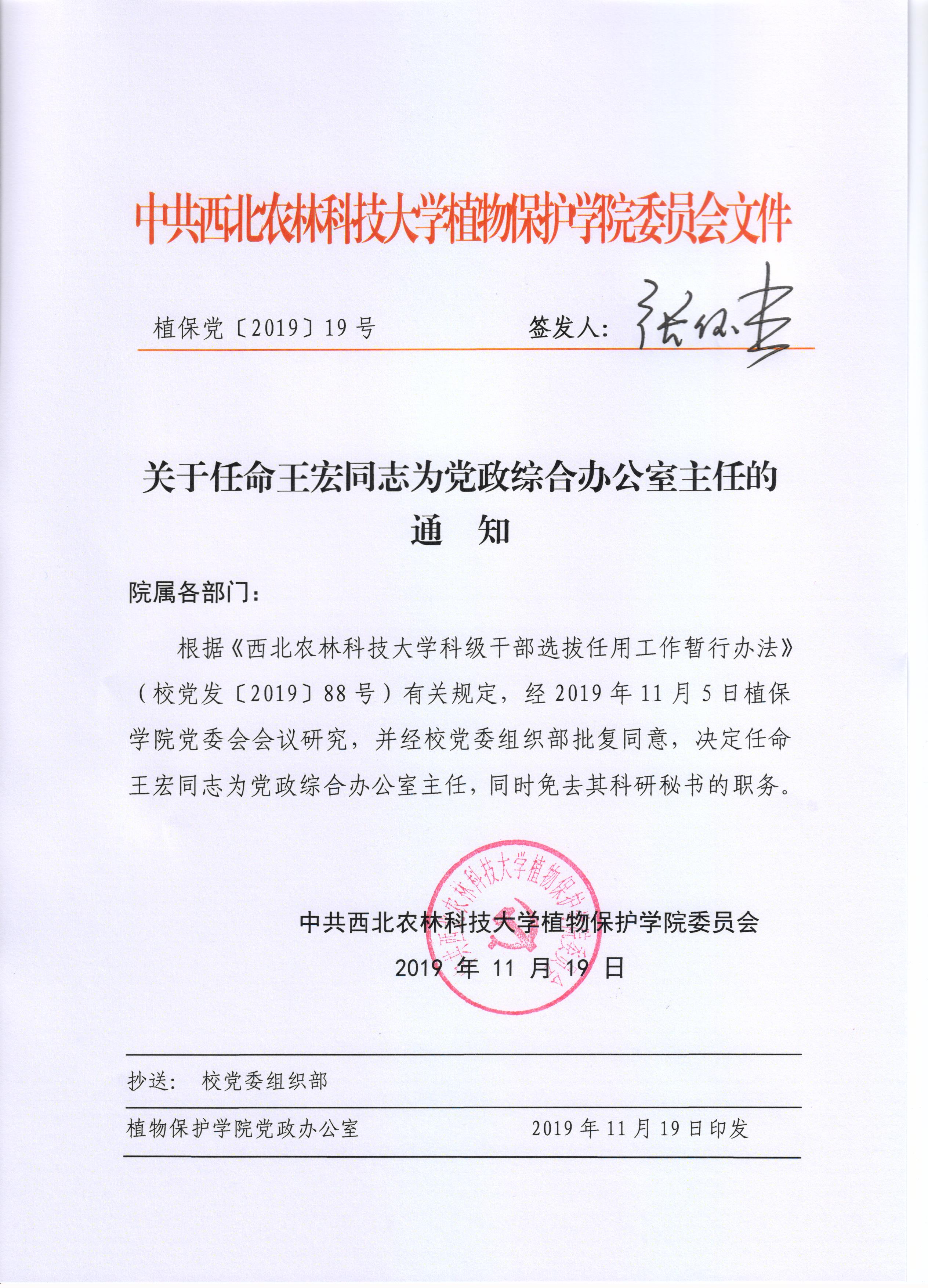 植保党〔2019〕年19号关于任命王宏为党政综合办公室主任通知