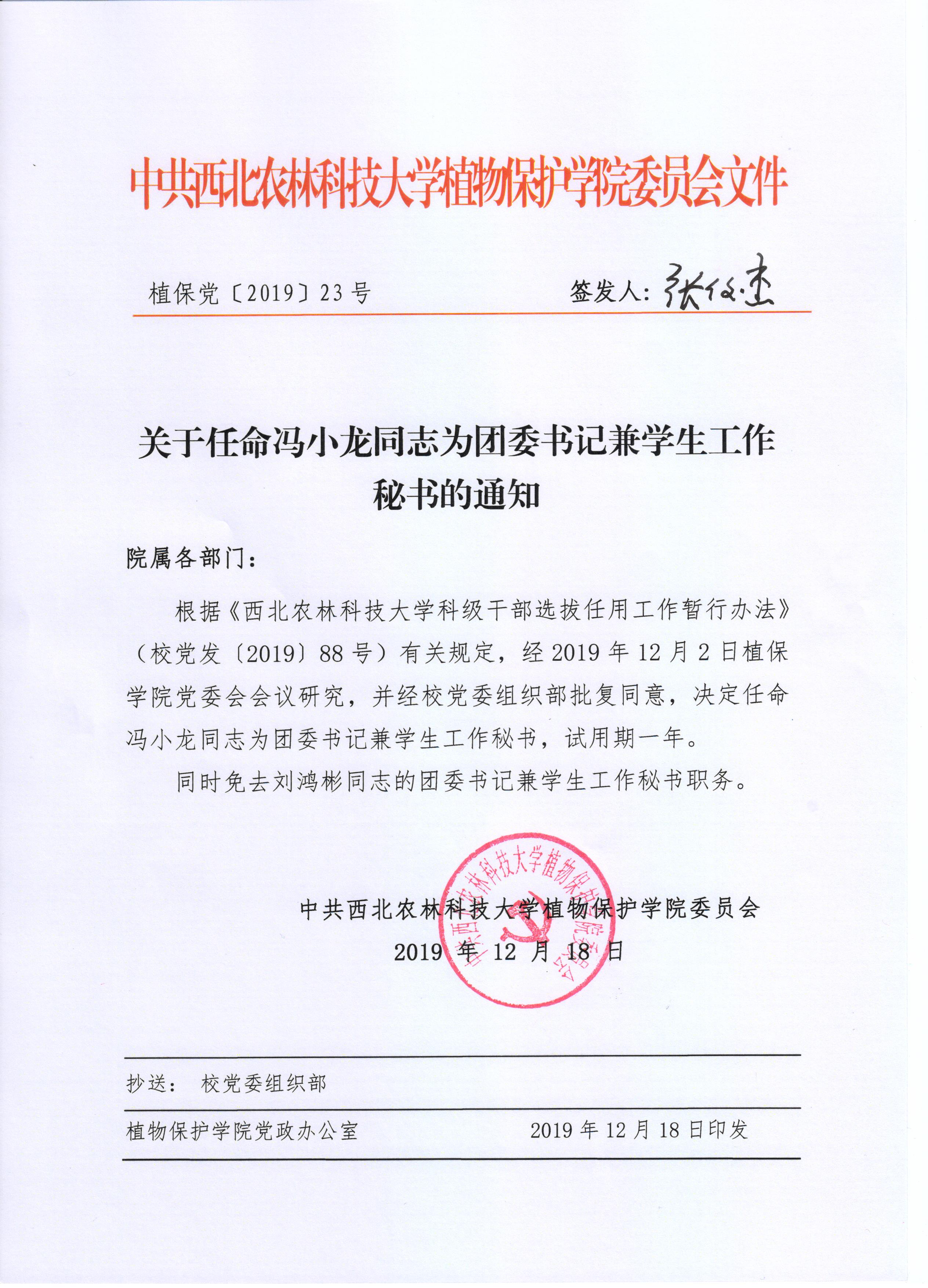 植保党〔2019〕年23号关于任命冯小龙同志为团委书记兼学生工作秘书的通知